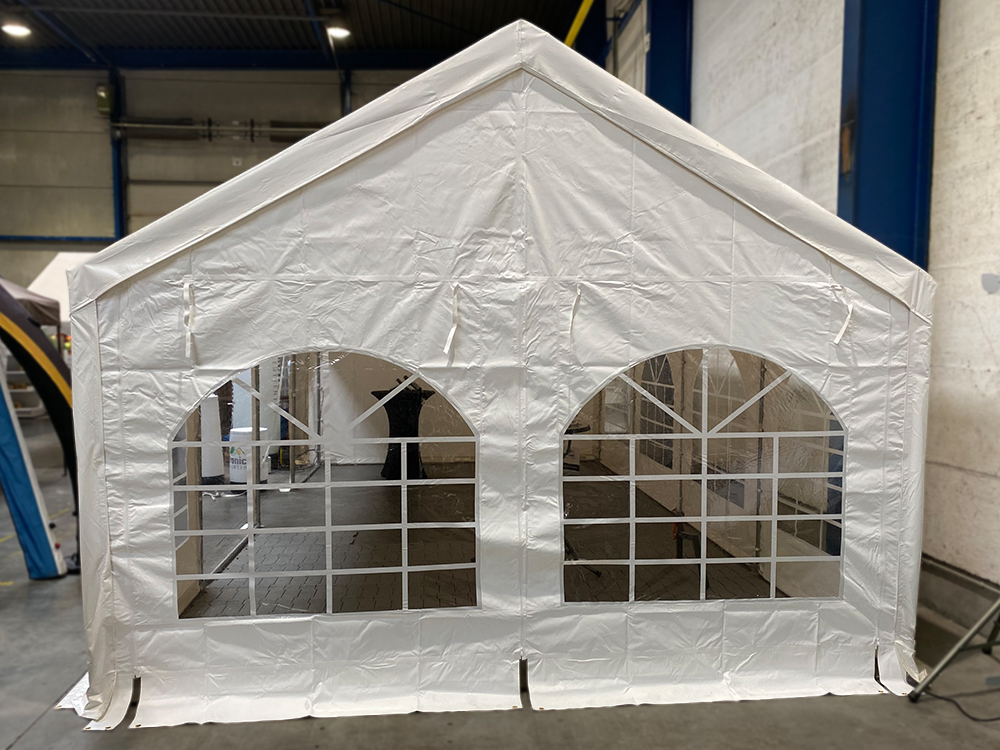 Cette tonnelle blanche ou beige se compose d’une bâche de toit super forte en pvc, identique à celle qu’on utilise pour des camions (550 gr/m²). Fixez les murs en pièces de 2 mètres à l’aide des bandes de velcro et des anneaux avec des tendeurs élastiques. Les faces latérales sont fabriquées en pvc de 500 gr/m², et en bas il y des rabats anti-courant d’air, qui empêchent le vent et la pluie d’envahir la tente. Les deux parois latérales (chaque paroi se compose de 2 x 2 mètres) ont 2 fenêtres, et aux côtés transversales il y a une porte qui est prévue d’une tirette solide. En bas des parois se trouvent des fentes par lesquelles vous passez le cadre de sol (optionnel).